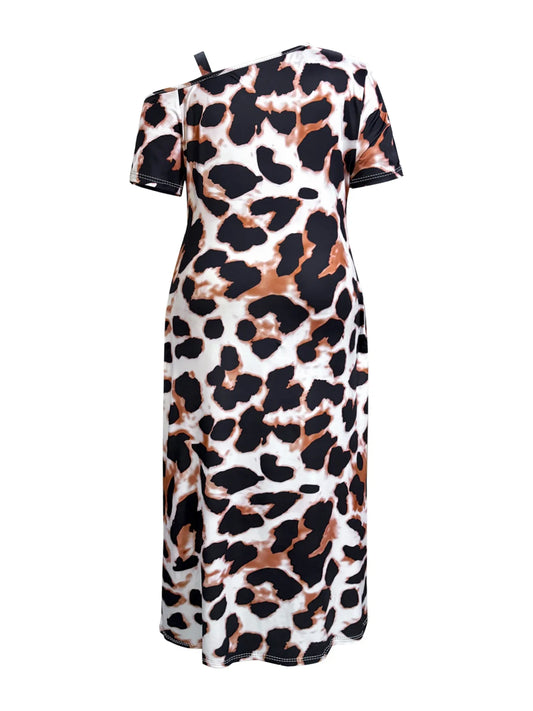 Women's Plus Size Leopard Print Short Sleeve Maxi Dress with Side Slit for Elegant Summer Wear 95% Polyester 5% Spandex