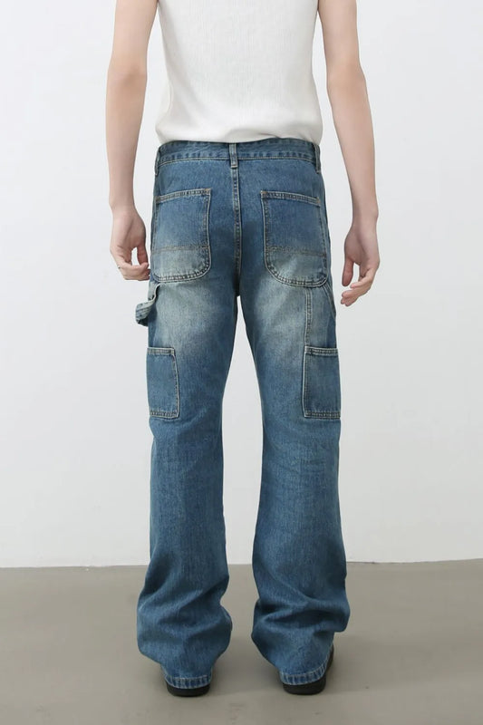 Mens Cargo Wide Leg Jeans with Multiple Pockets Washed Durable Denim Pants for Casual Everyday Outdoor Wear Comfort Fit