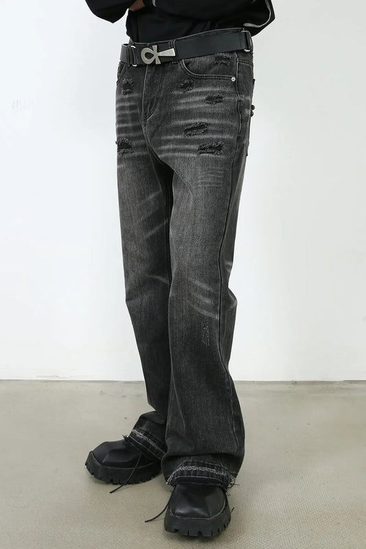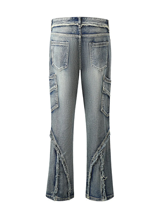 Mens Distressed Wide Leg Jeans with Raw Hem Pocketed Denim Pants for Casual Streetwear Fashion Durable Versatile