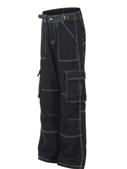 Mens Drawstring Wide Leg Cargo Jeans Relaxed Fit Pocketed Durable Versatile Everyday Casual Streetwear Ideal City Living