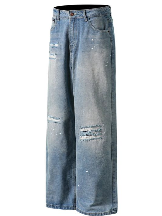 Mens Distressed Wide Leg Jeans with Washed Finishes and Slight Stretch for Everyday Casual Denim Pants Durable