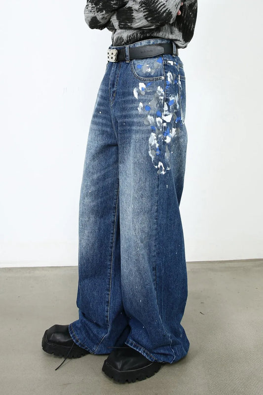 Men Wide Leg Jeans with Paint Splatter Non Stretch Durable Denim Pants Loose Fit Casual Streetwear Trendy Fashion
