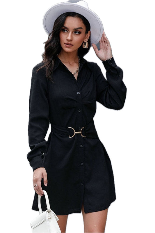 Women's belted mini shirt dress with collar long sleeves solid pattern 100% Polyester fabric for versatile daily wear