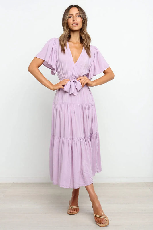 Women's Tie Waist Flutter Sleeve Surplice Midi Dress 100% Polyester Solid Casual Everyday Outfit Lightweight Flowy