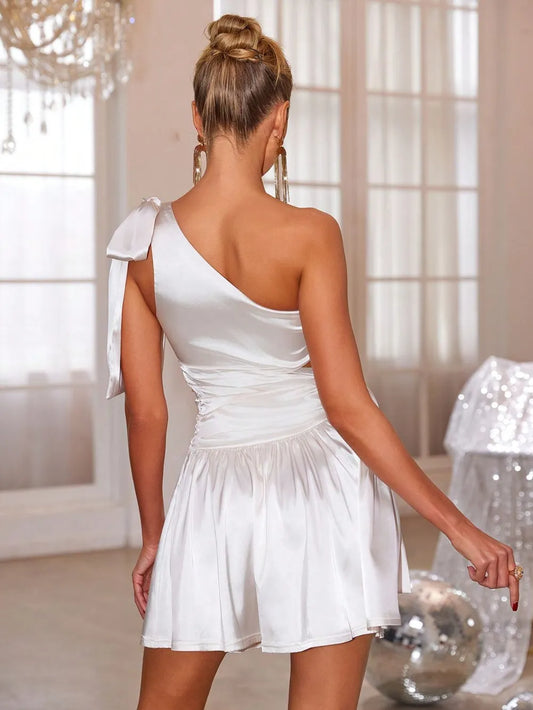 Women's Tied Cutout Single Shoulder Mini Dress with Stretch Silhouette ninety percent polyester and ten percent elastane