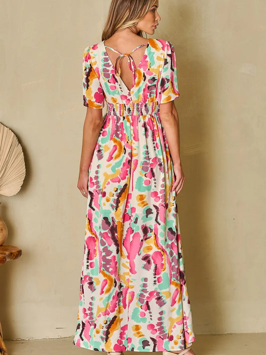 Women's Slit Printed V Neck Cap Sleeve Maxi Dress 100% Polyester Fabric Designed for Everyday Elegance and Easy Care