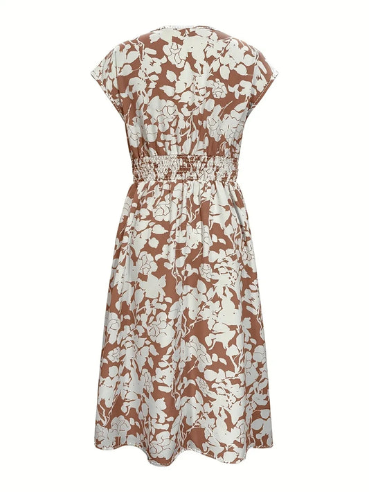 Women's Printed V Neck Cap Sleeve Midi Dress with ninety five percent polyester and five percent spandex soft finish