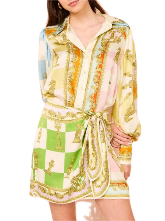 Women's Printed Long Sleeve Shirt Dress with Buttoned Tie Details 100% Polyester Fabric for Everyday Wear Comfort