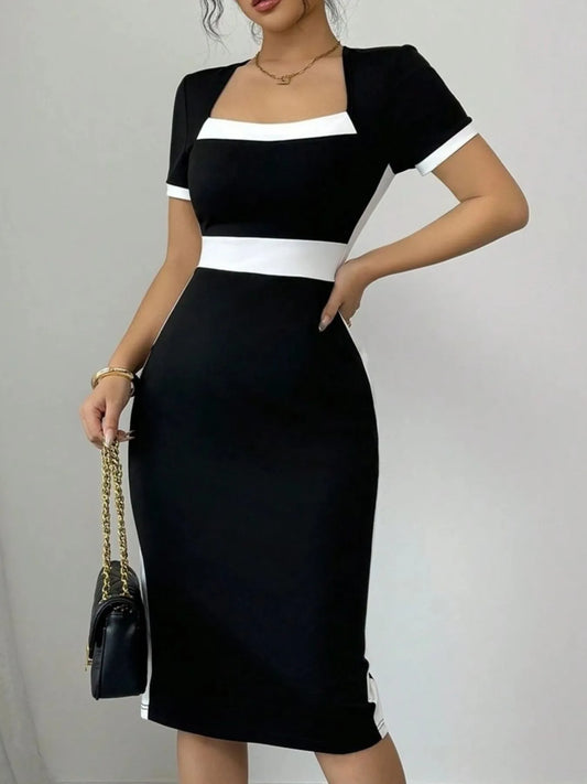 Women's Two Tone Short Sleeve Bodycon Dress with Stretch Ninety Five Percent Polyester and Ten Percent Spandex
