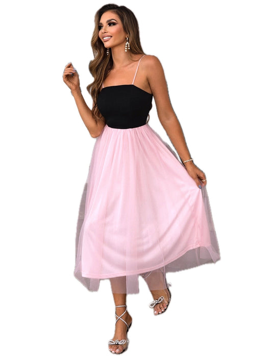 Women's Two-Tone Spaghetti Strap Mesh Dress with Straight Neckline Midi Casual Chic Zipper 95% polyester 5% elastane