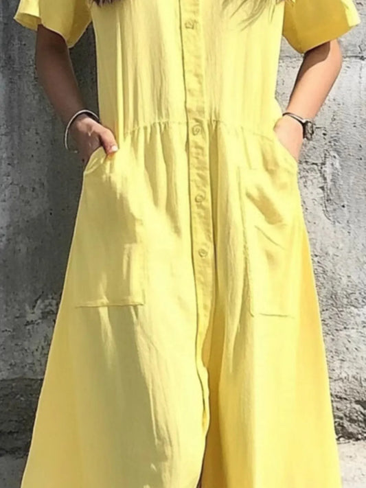 Women's Button Front Short Sleeve Midi Dress 100% Polyester with Pockets Lightweight Everyday Dress Easy Care Casual