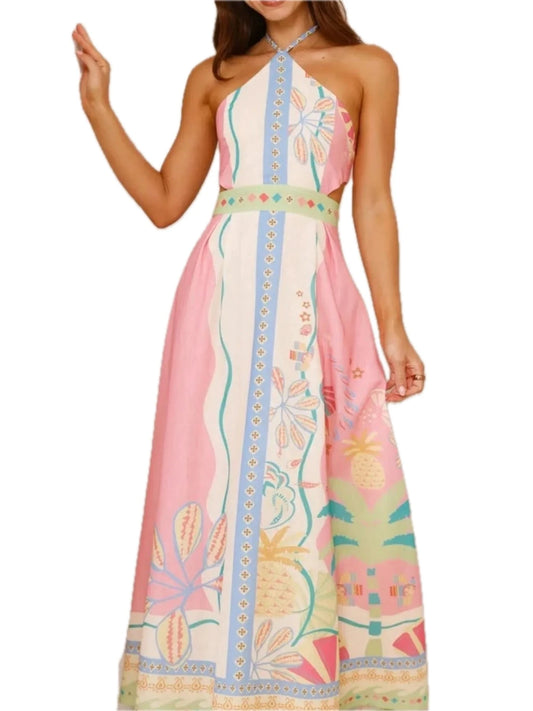 Women's Halter Neck Printed Maxi Dress 100% Polyester Backless Unlined Flowing Silhouette Ideal for Summer Events