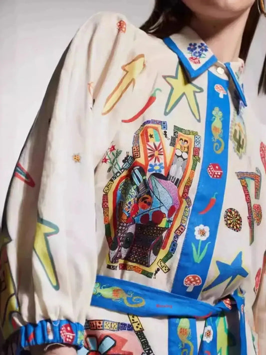 Women's Printed Tie Waist Mini Shirt Dress with Belted Front Button Details Polyester % Fabric with lightweight drape