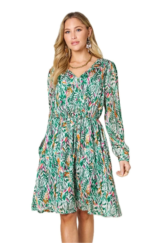 Women's Tiered Printed Notched Long Sleeve Midi Dress 100% Polyester Fabric Lightweight Elegant Everyday Dress Versatile
