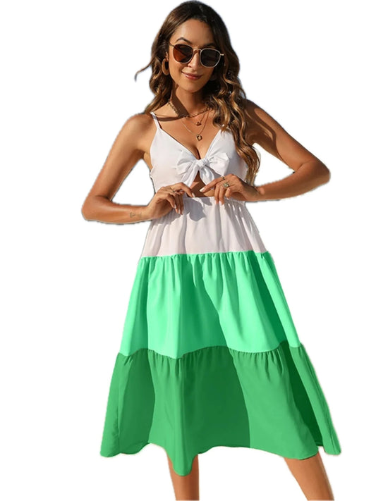 Women's Color Block Tie Front Midi Dress 100% Polyester Fabric No Stretch Machine Wash Cold Everyday Casual Wear