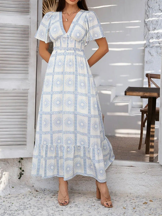 Women's Smocked Printed V Neck Flounce Sleeve Dress 100% Polyester Fabric Lightweight Casual Everyday Wear All Season