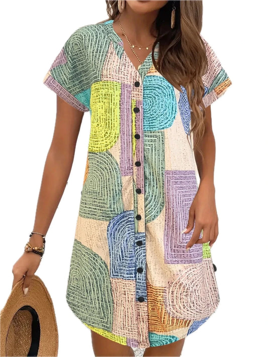 Women's Geometric V-Neck Short Sleeve Button Front Dress 100% Polyester Comfortable Casual Chic Everyday Allseason Wear