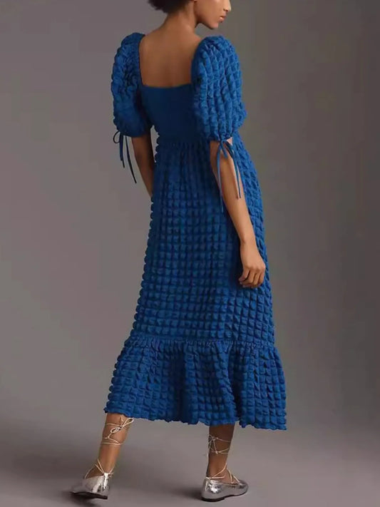 Women's Textured Sweetheart Neck Short Sleeve Dress with Smocked Bodice and Tied Waist 80% Polyester 20% Cotton