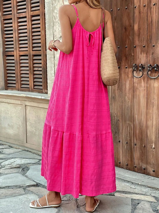 Women's Scoop Neck Cami Maxi Dress with Tiered Ruffles and Tie Details 100% Polyester Fabric for Summer Everyday