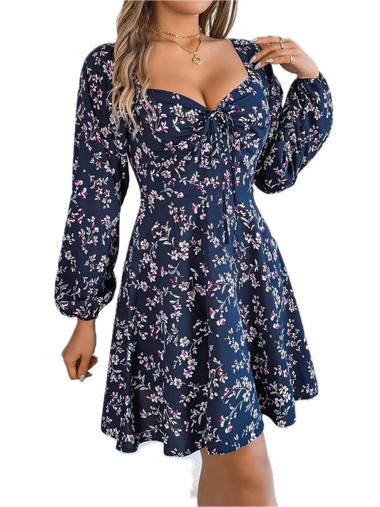 Women's Printed Sweetheart Neck Balloon Sleeve Mini Dress 100% Polyester Lightweight Everyday Summer Casual Chic Dress