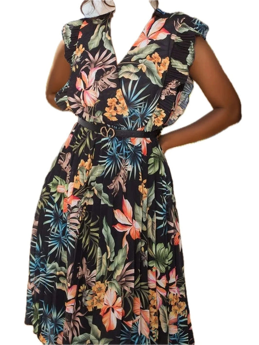 Women's Plus Size Ruffled Printed V Neck Midi Dress with Buttoned Ruched Details 100% viscose fabric Everyday Wear
