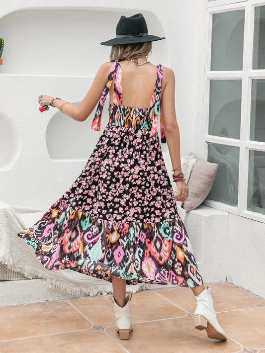 Women's Printed Plunge Sleeveless Midi Dress 100% Polyester Tied Sheer Opaque Stretch Elegant Evening Attire Collection