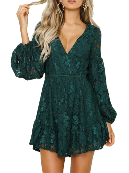 Women's Lace V-Neck Long Sleeve Mini Dress with Buttoned Tied Details Lined for Comfort 95% Polyester 5% Spandex