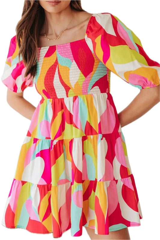 Women's Printed Square Neck Puff Sleeve Dress with Smocked Details Not Lined 100% Polyester Fabric Imported Casual
