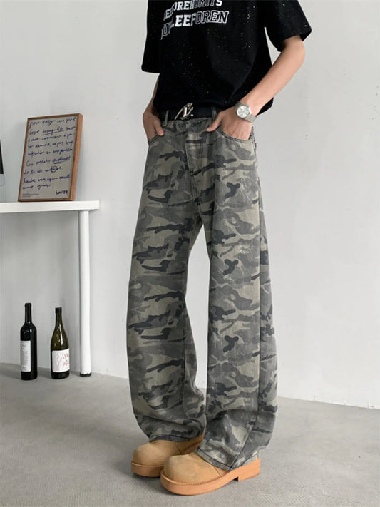 Men Camouflage Cargo Jeans Wide Leg Oversized Fit with Pockets Durable Casual Pants for Everyday Wear For Daily Use