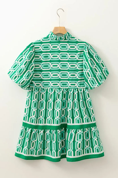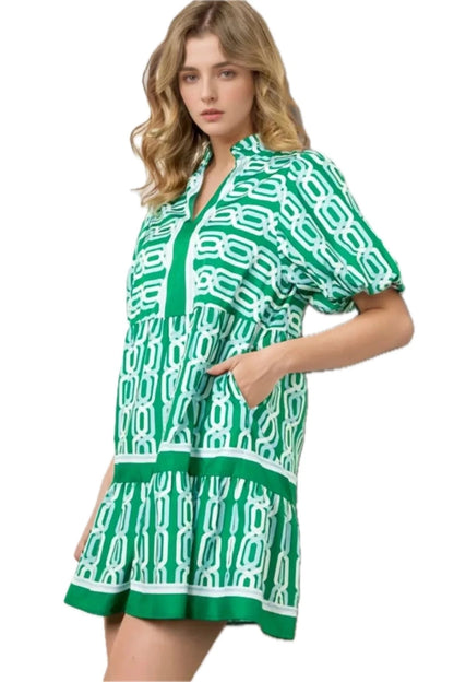 Women's Abstract Patterned V Neck Puff Short Sleeve Mini Dress Perfect for Summer Lightweight Silhouette 100% Polyester