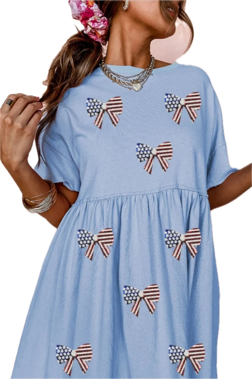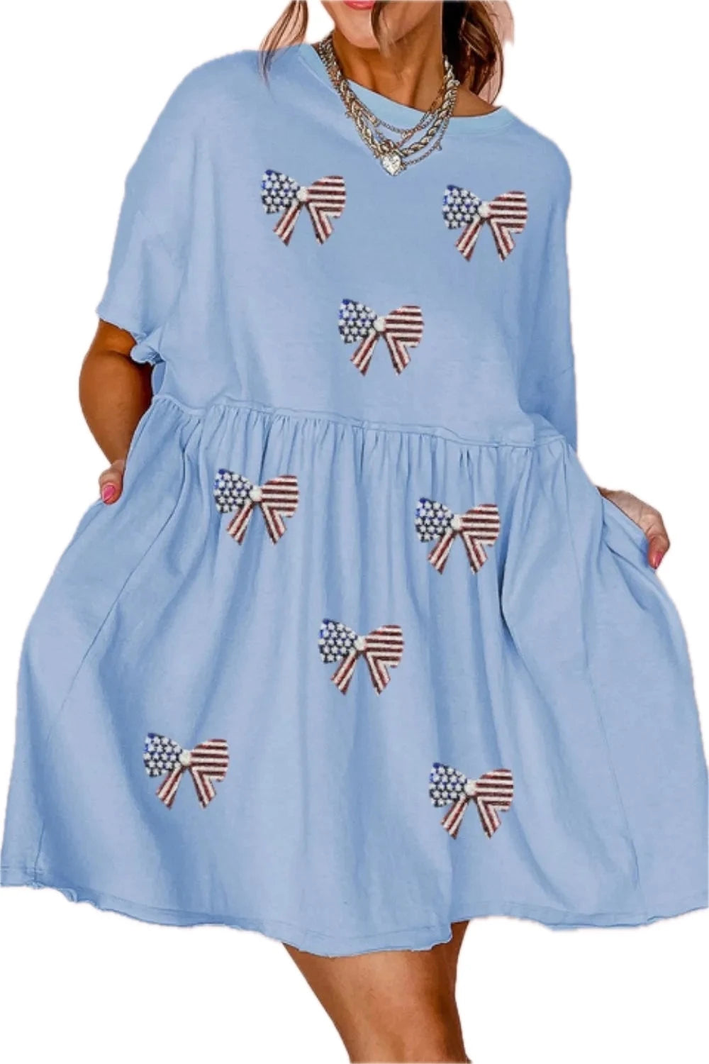 Women's American Flag Bow Print Dress with sixty two percent polyester thirty two percent cotton six percent elastane