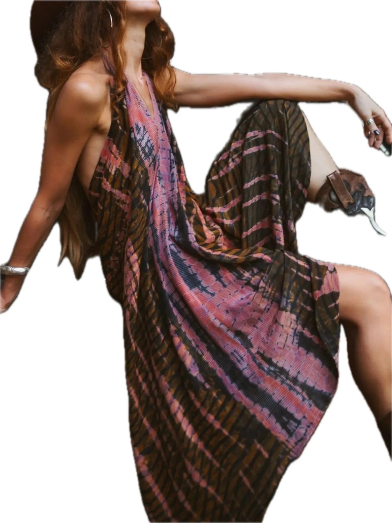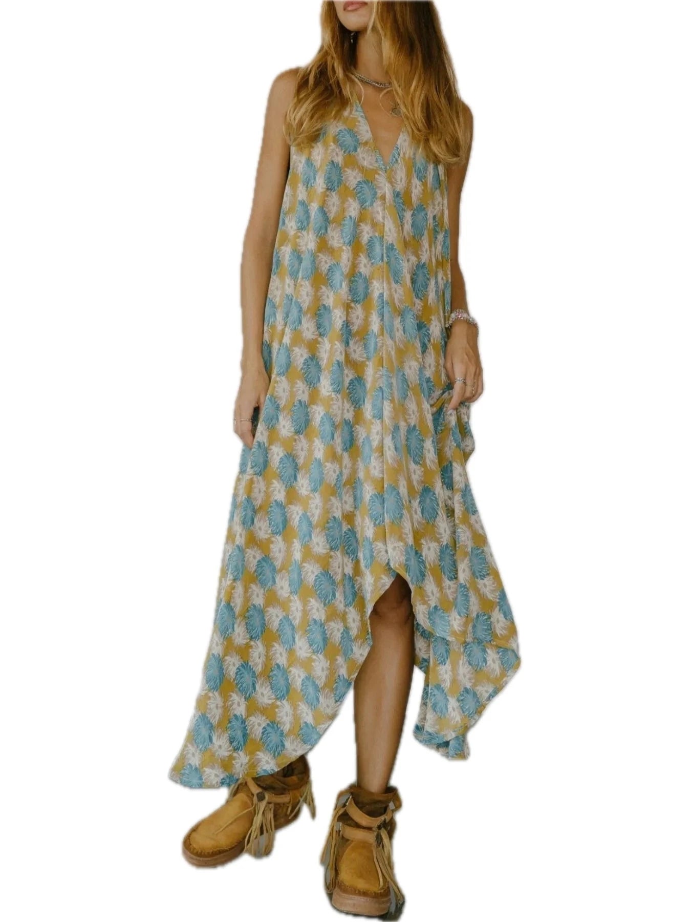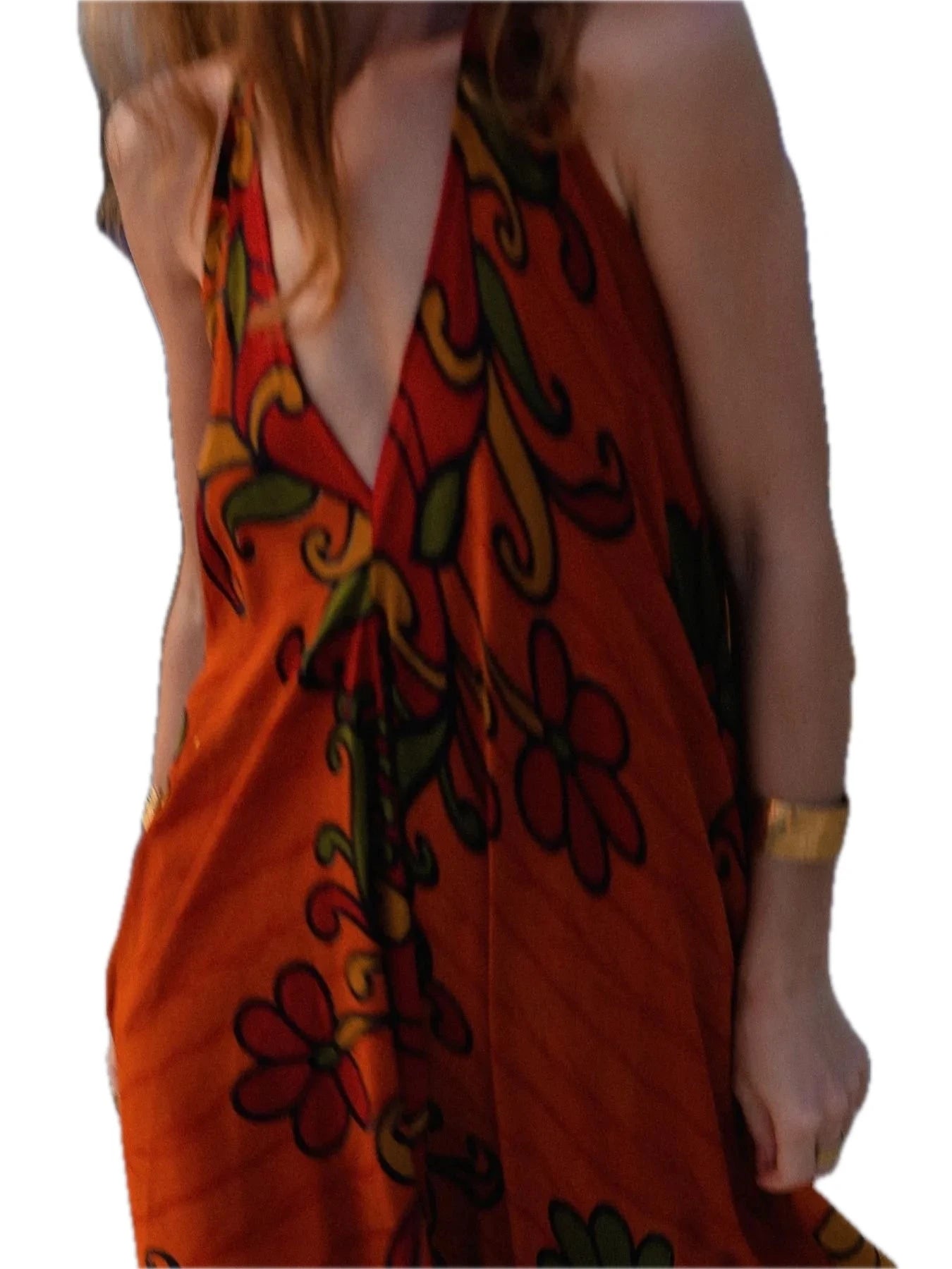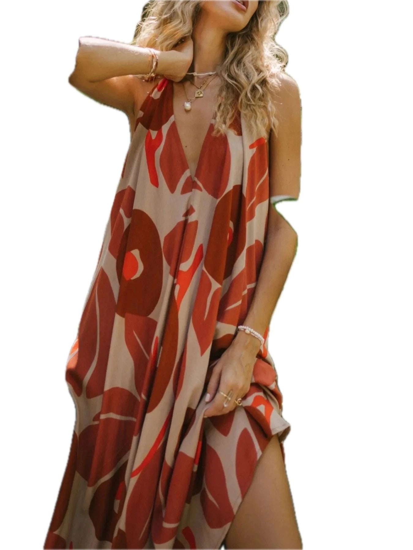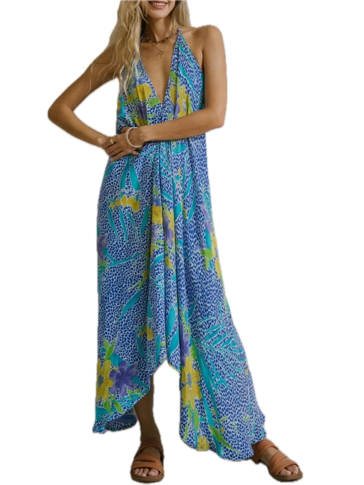Women's Asymmetrical Hem Printed Halter Neck Dress with 100% Polyester Fabric Backless Style Lightweight Summer Look