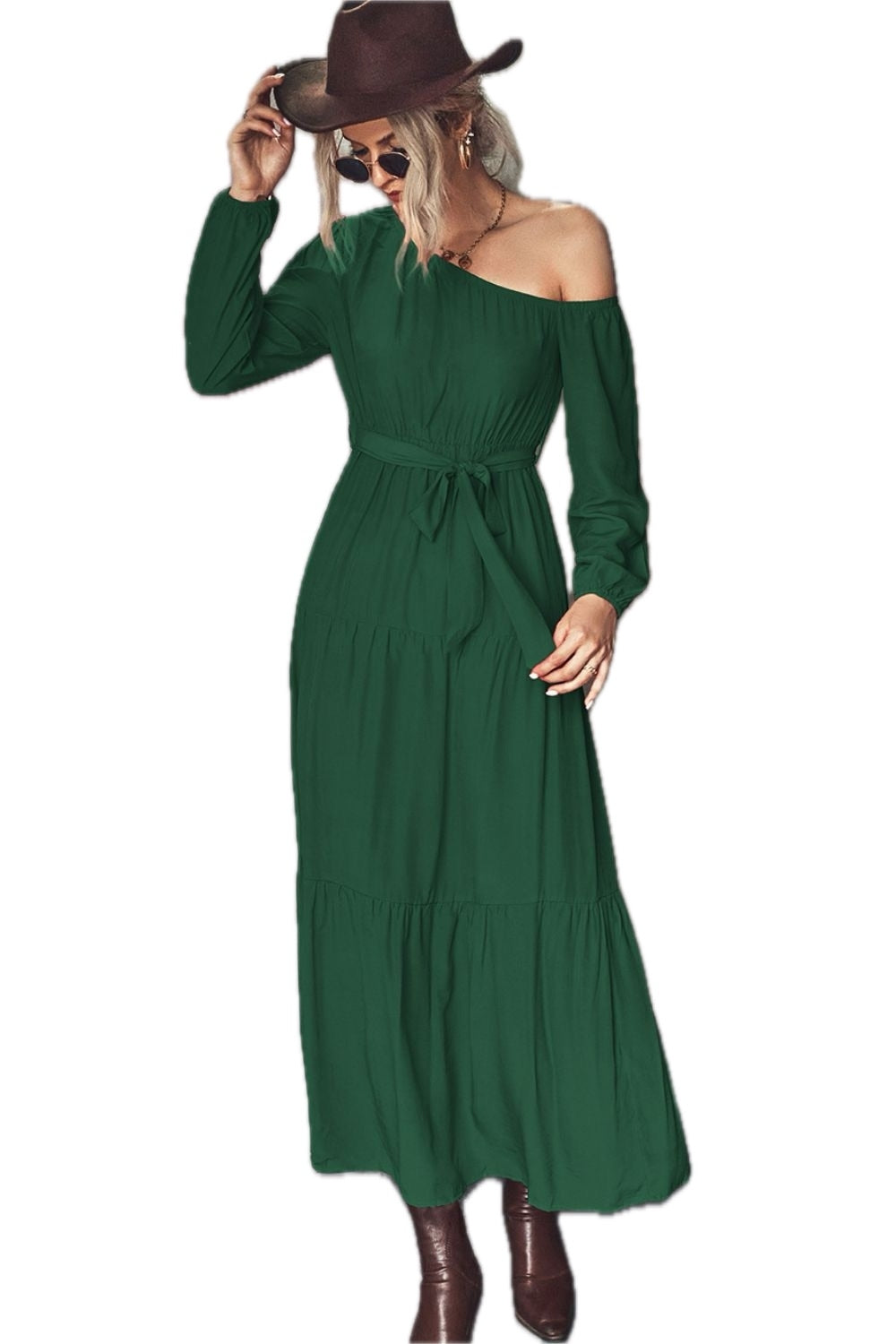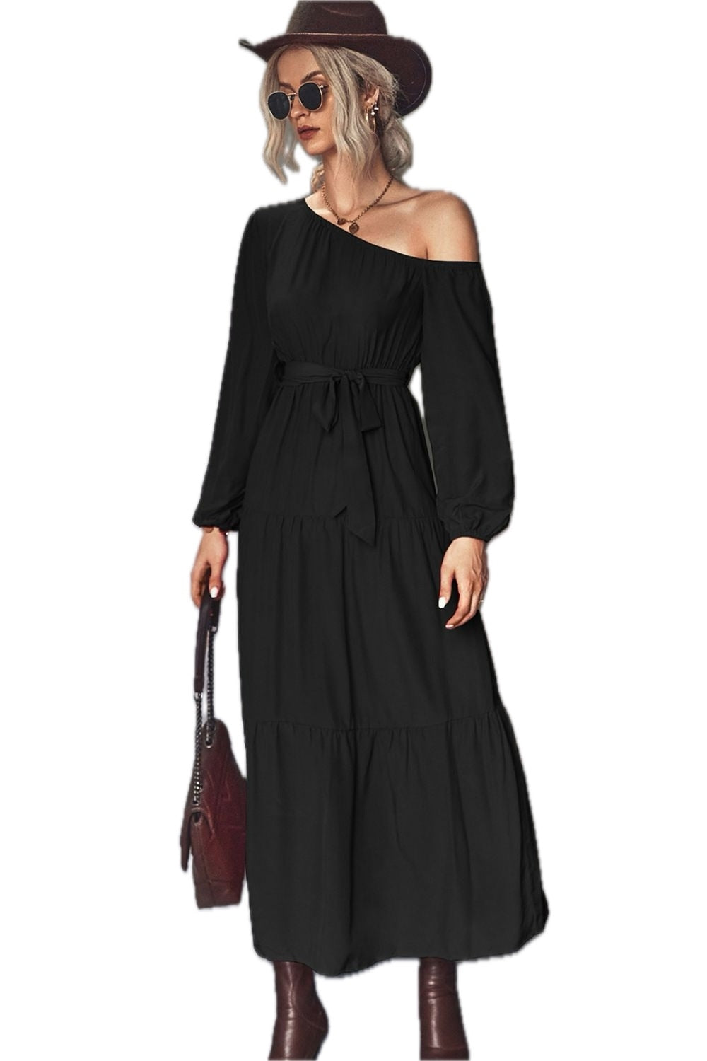 Women's Belted One Shoulder Tiered Maxi Dress with Tie Neckline and Balloon Sleeves Vacation 95% polyester 5% spandex