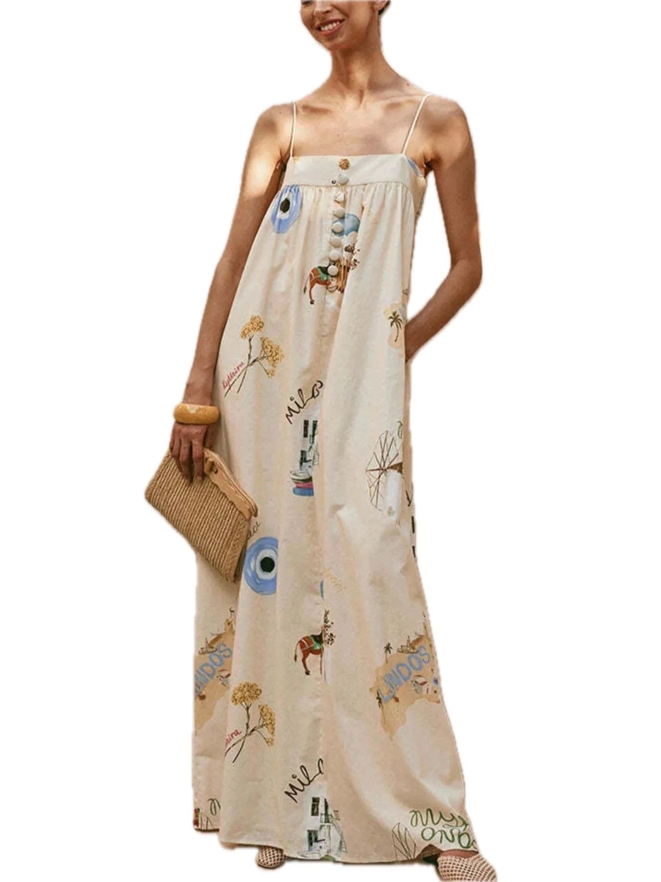 Women's Bohemian Print Cami Maxi Dress with Pockets 95% Cotton 5% Spandex Comfortable Everyday Dress Easy Care