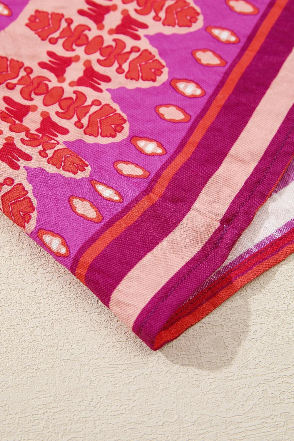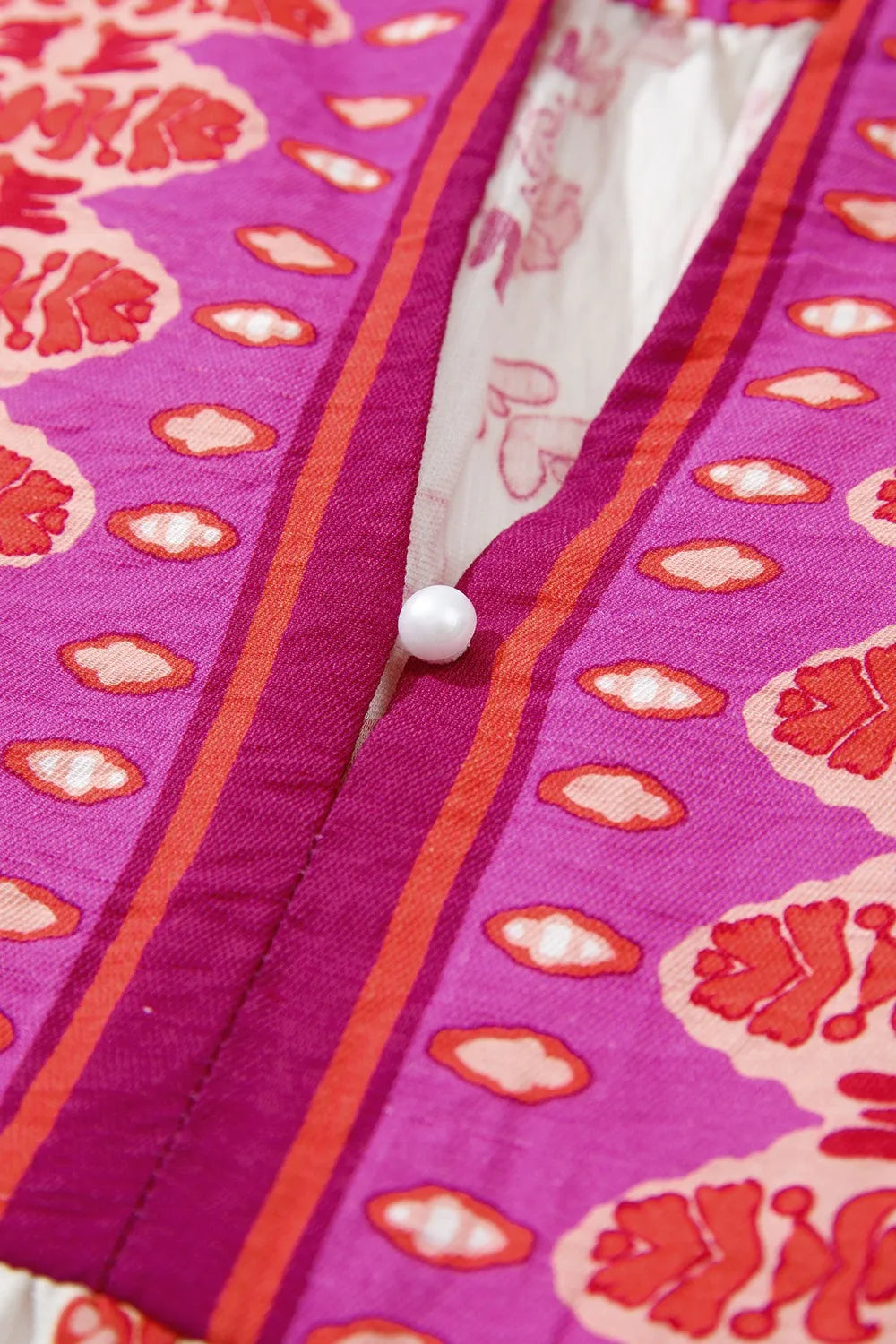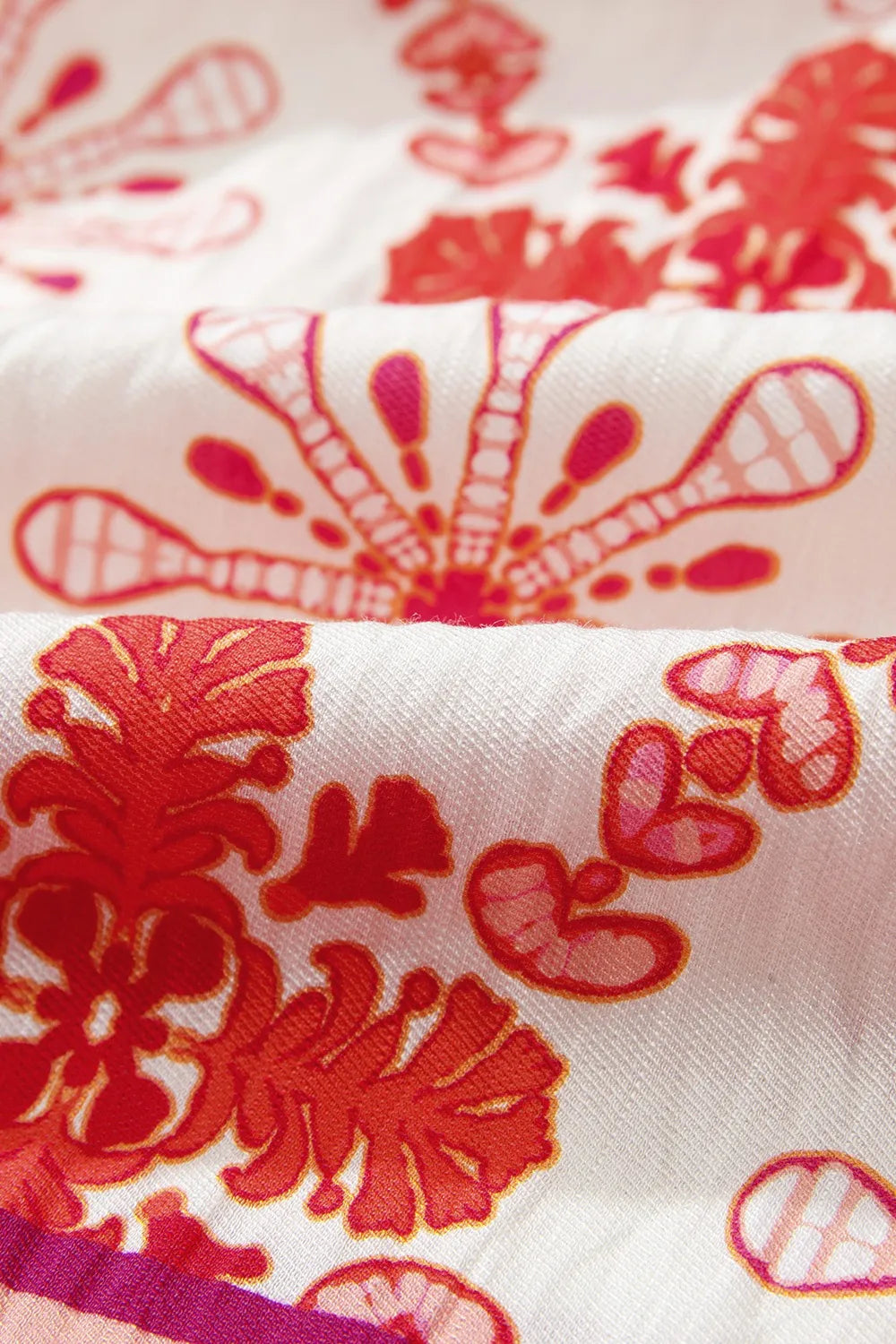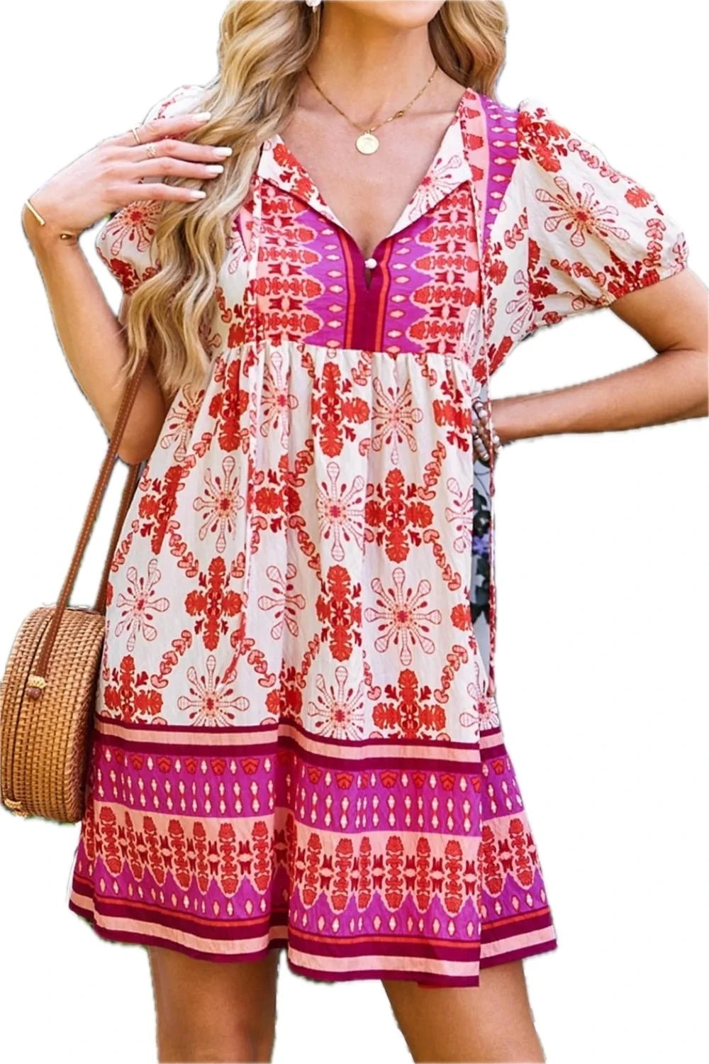 Women's Boho Floral Short Sleeve Tie Neck Mini Dress eighty four percent viscose and sixteen percent polyamide