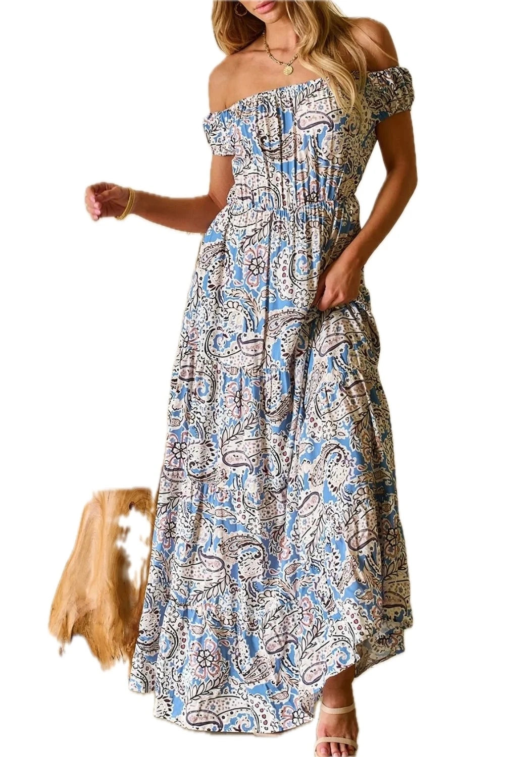 Women's Boho Paisley Print Off Shoulder Maxi Dress with One Hundred Percent Viscose Fabric for a Flowy Summer Look