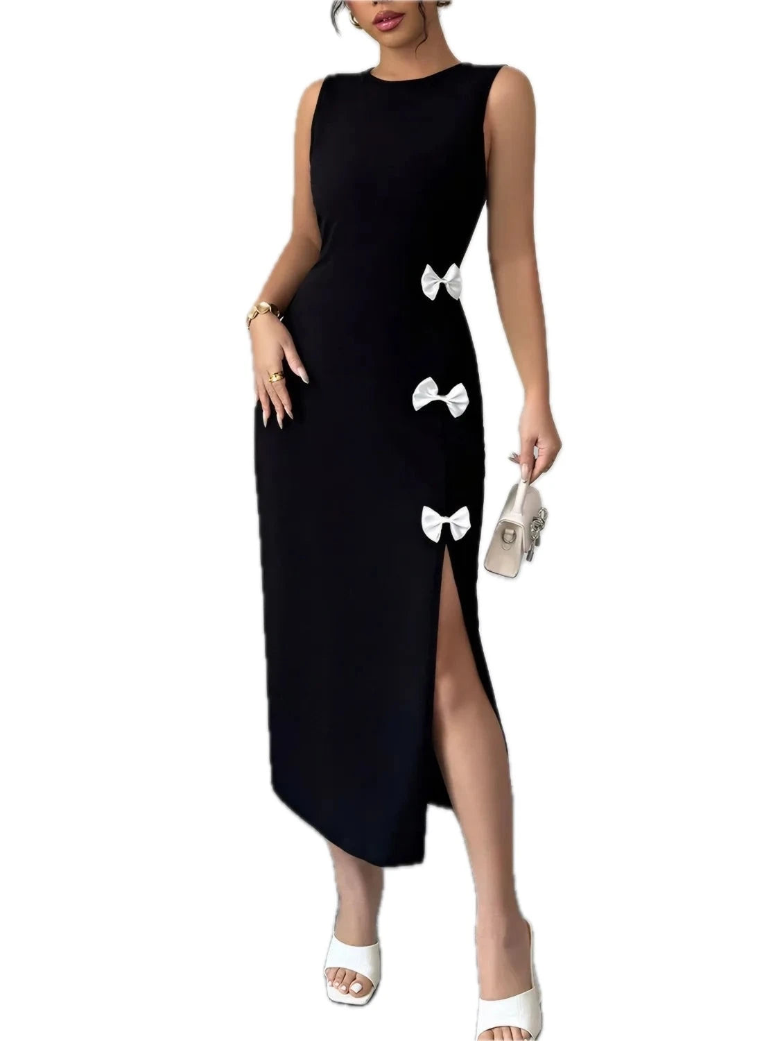 Women's Bow Slit Round Neck Sleeveless Dress with Stretch ninety five percent polyester five percent spandex fabric