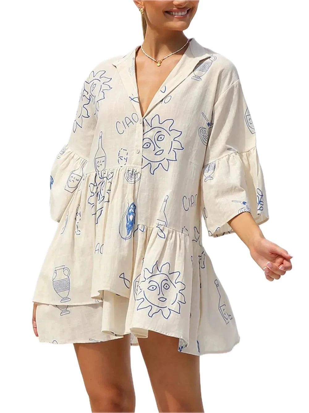 Women's Button Detail Printed Mini Dress with Ruched and Ruffled Design and Sheer Overlay 100% Polyester Fabric