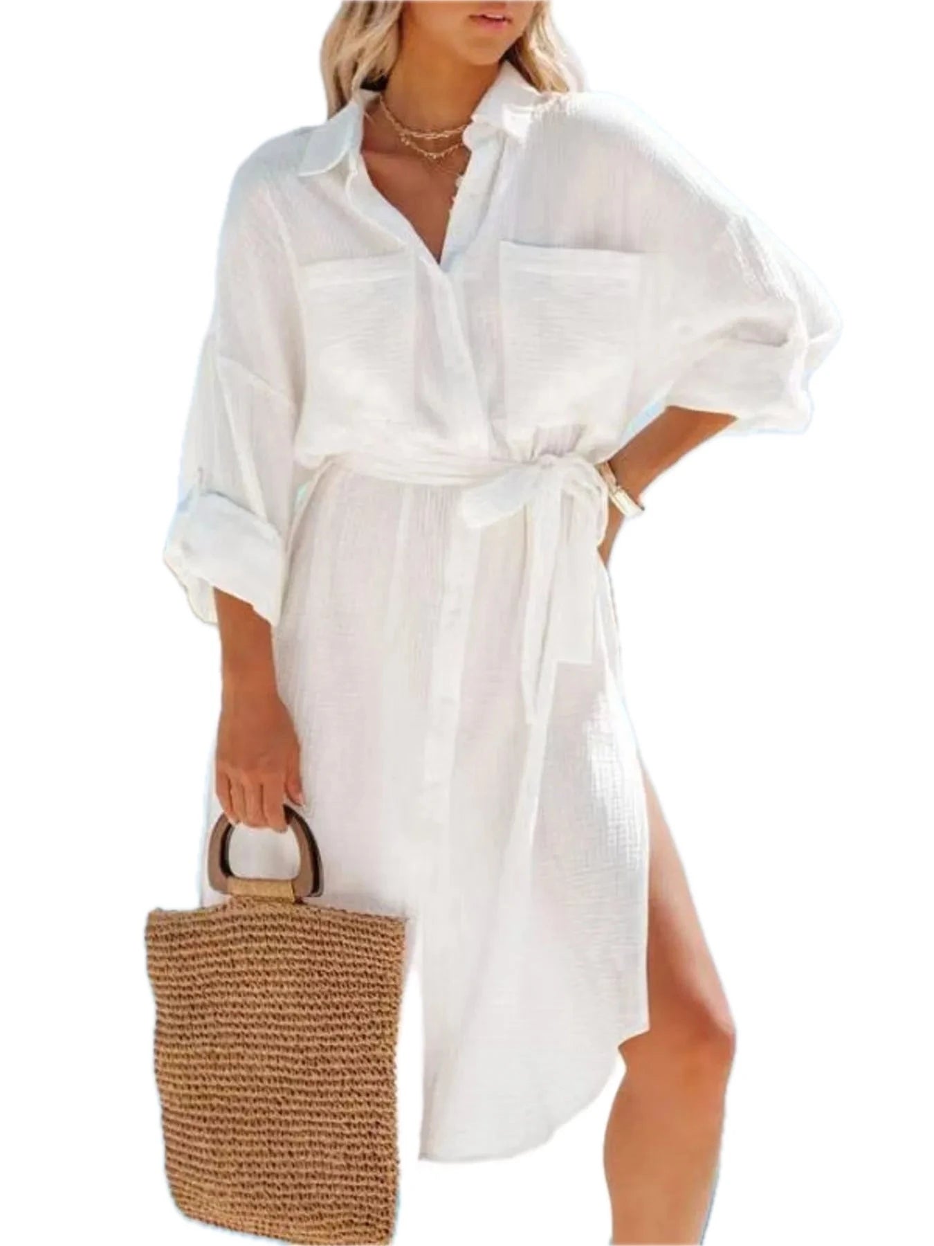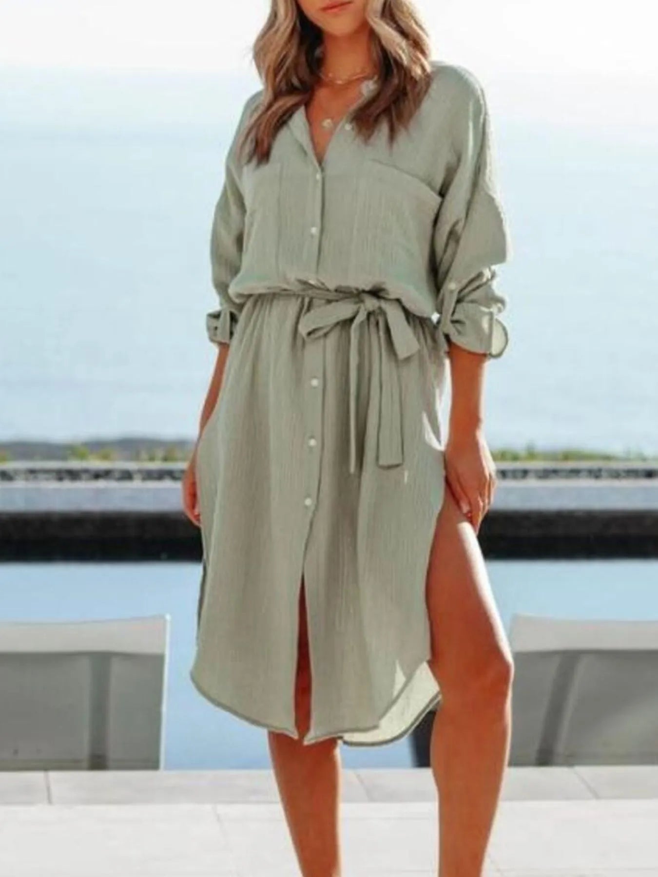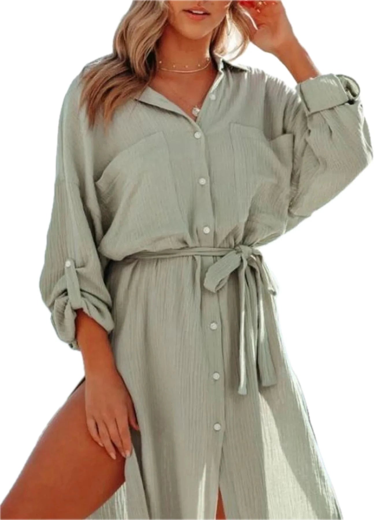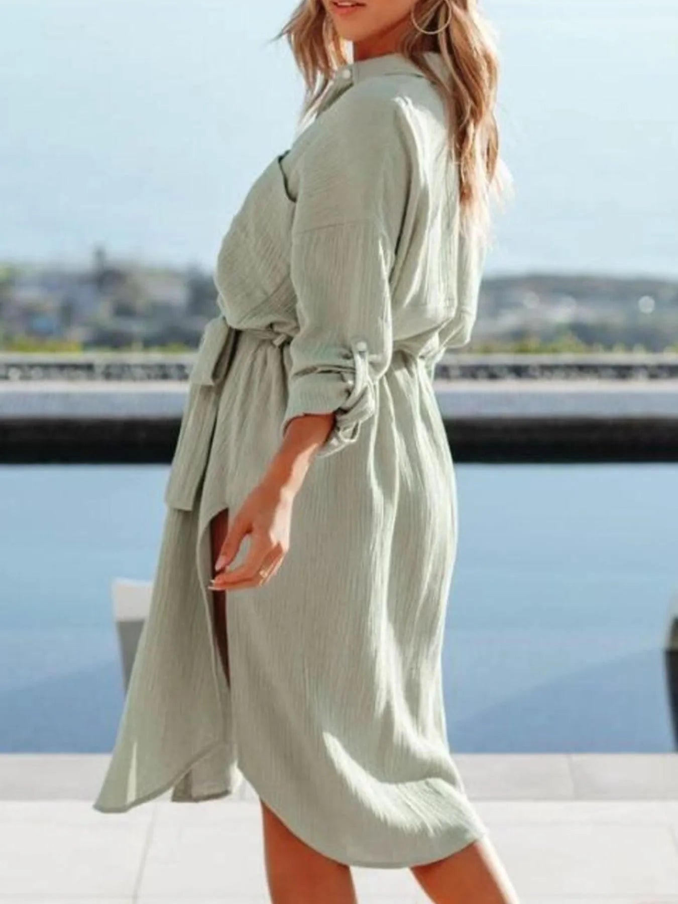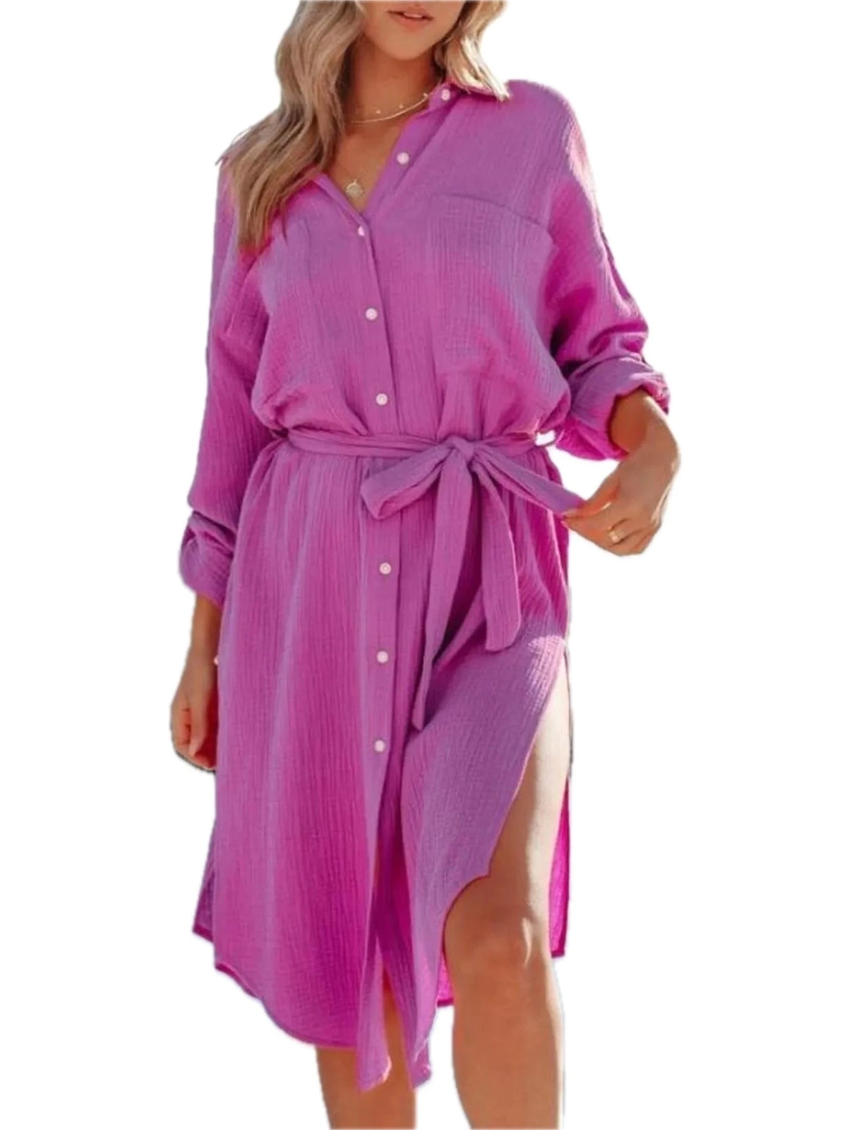 Women's Button Down Tie Waist Shirt Dress for Day to Night Wear 100% Polyester Fabric Easy Care Casual Everyday