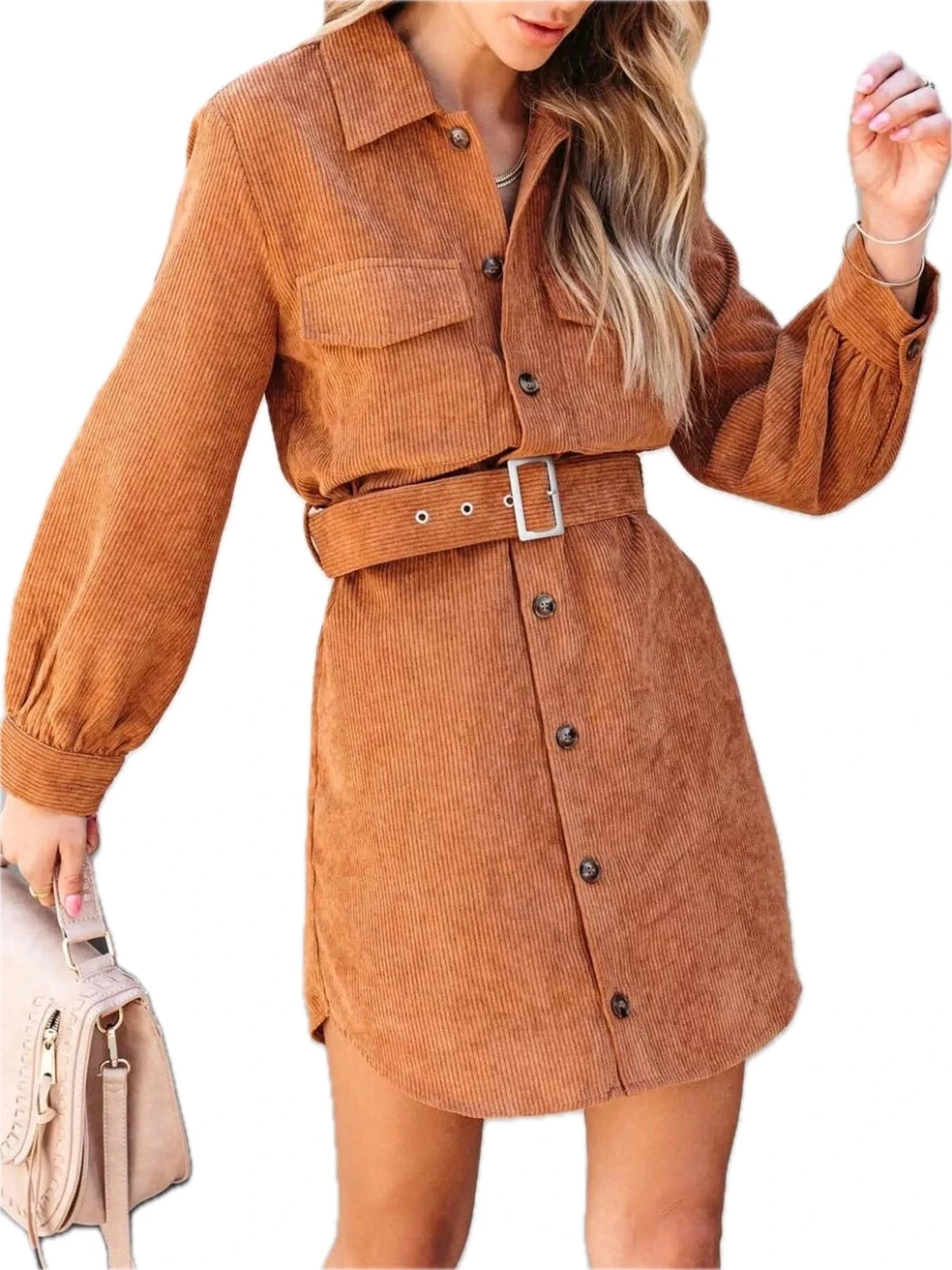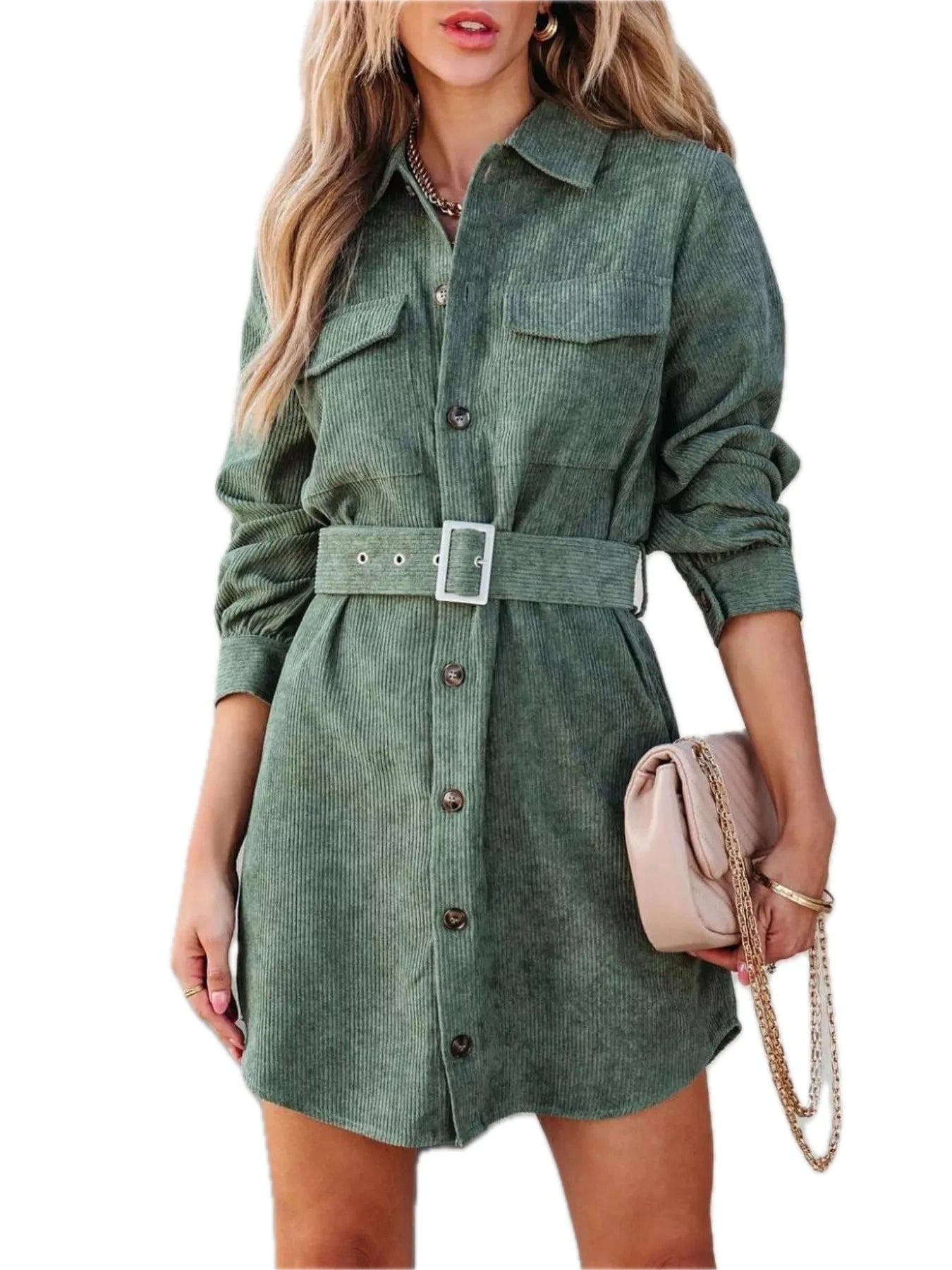 Women's Button Front Belt Long Sleeve Corduroy Dress with Pockets and Classic Belted Look Everyday Wear