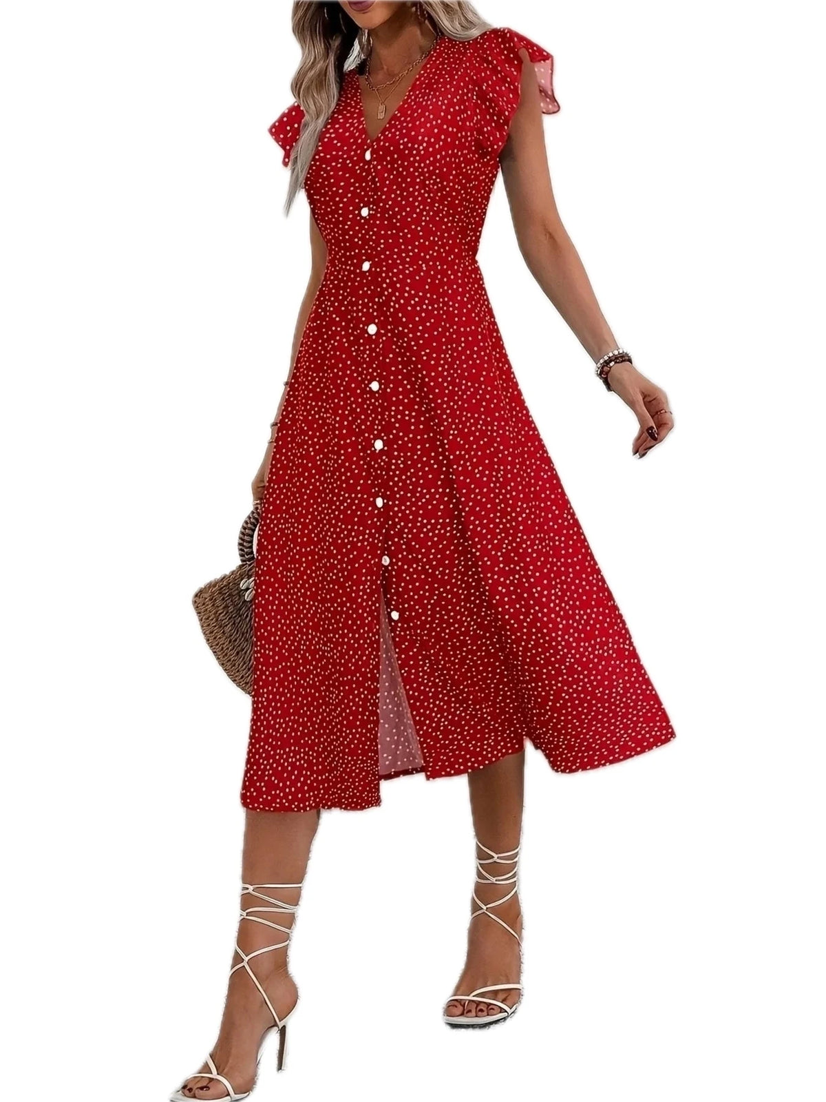 Women's Button Front Midi Dress with Ruffle Sleeves for Occasion Wear Flowy Fit 95% polyester and 5% spandex blend
