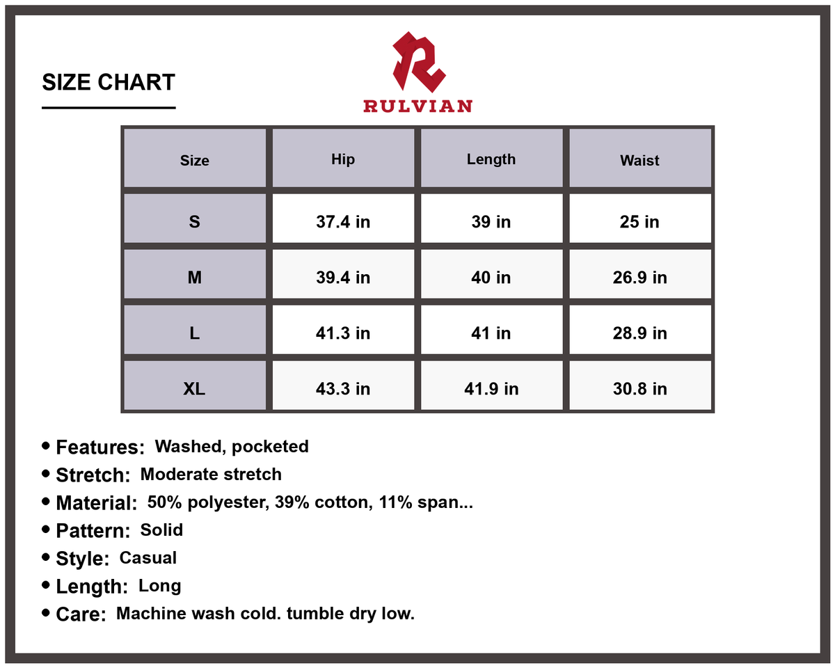 M: waist 26.9 in, hip 39.4 in, length 40 in