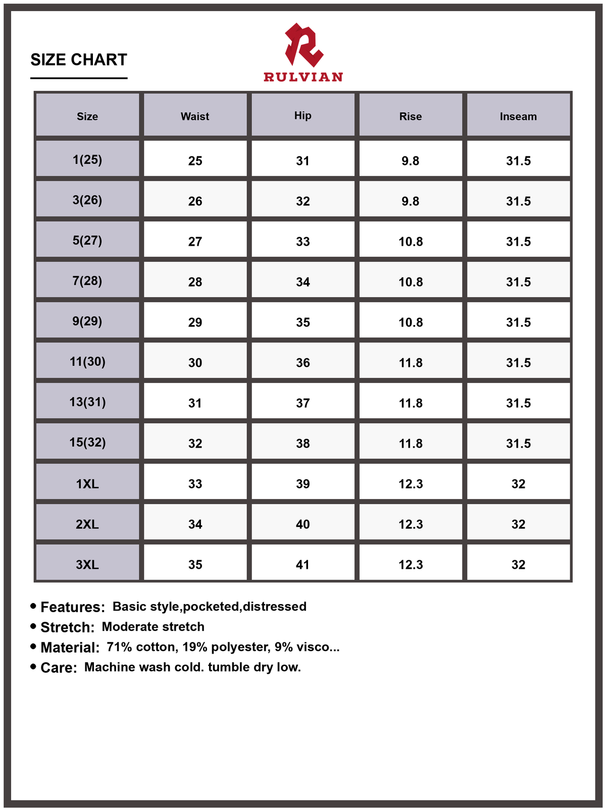 Size | Waist | Hip | Rise | Inseam |