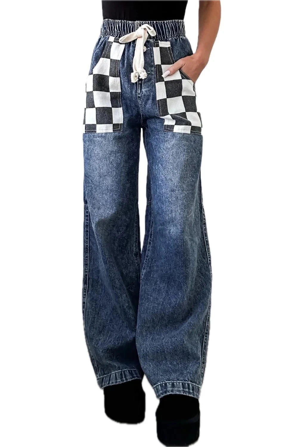 Womens Checkered Wide Leg Jeans High Waisted Pocketed Casual Fashion Pants Soft Rayon Blend Durable Everyday Wear