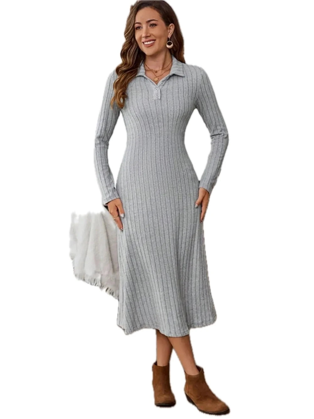 Women's Collared Neck Long Sleeve Midi Dress 95% Polyester 5% Spandex Slight Stretch for All Day Wear Everyday