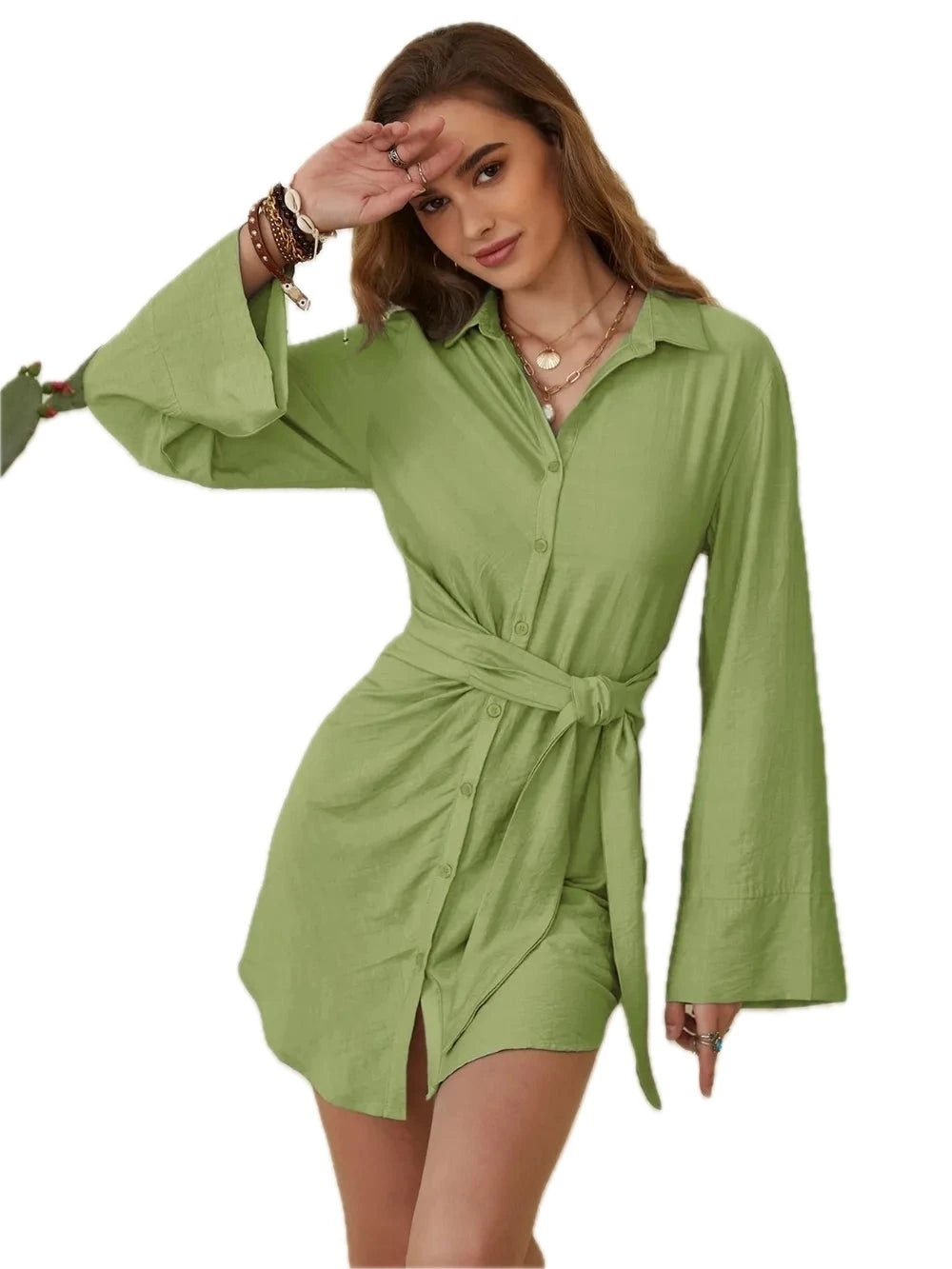 Women's Collared Neck Long Sleeve Mini Shirt Dress 50% Polyester 50% Viscose for Elegant Everyday Wear Lightweight