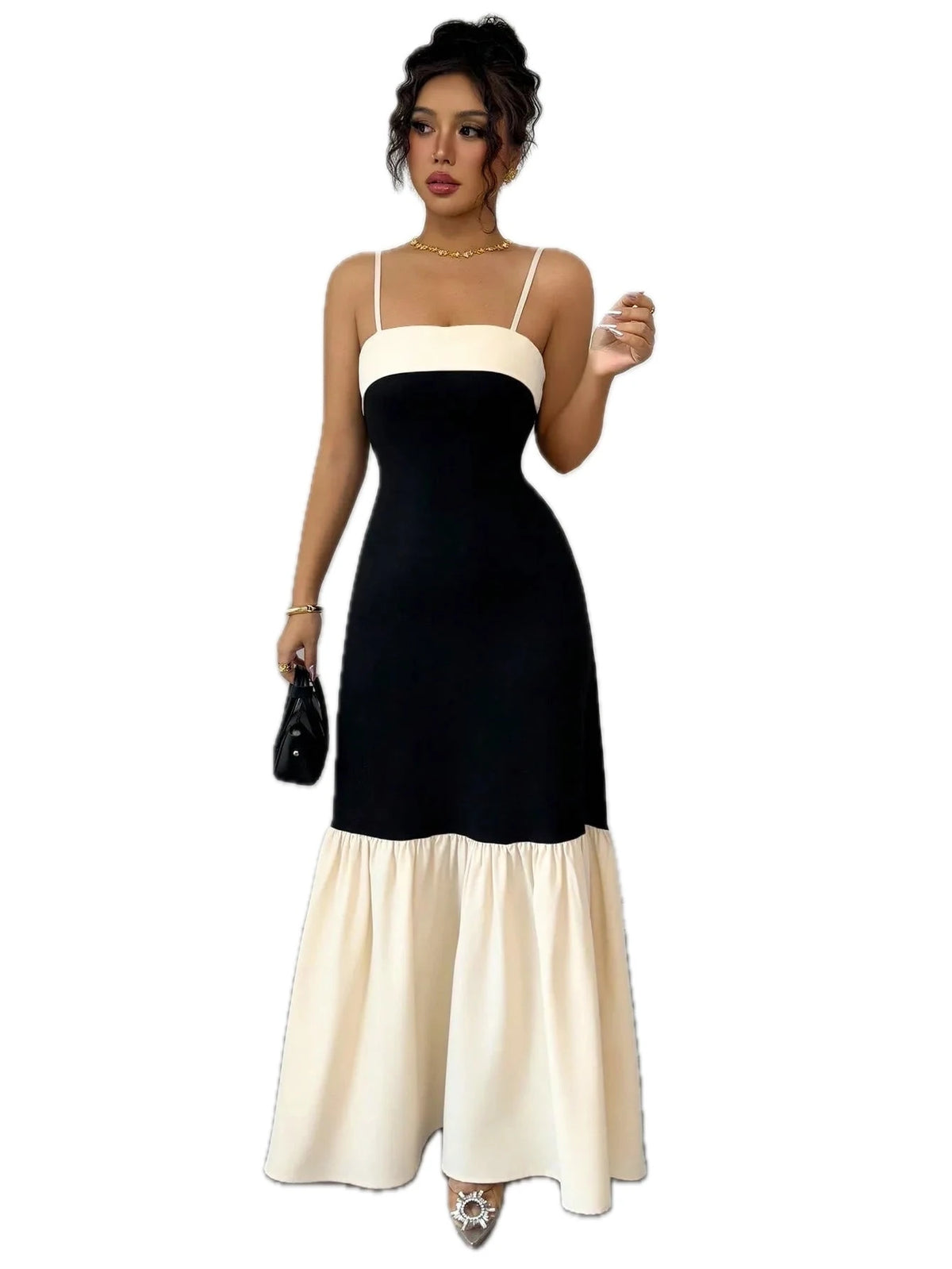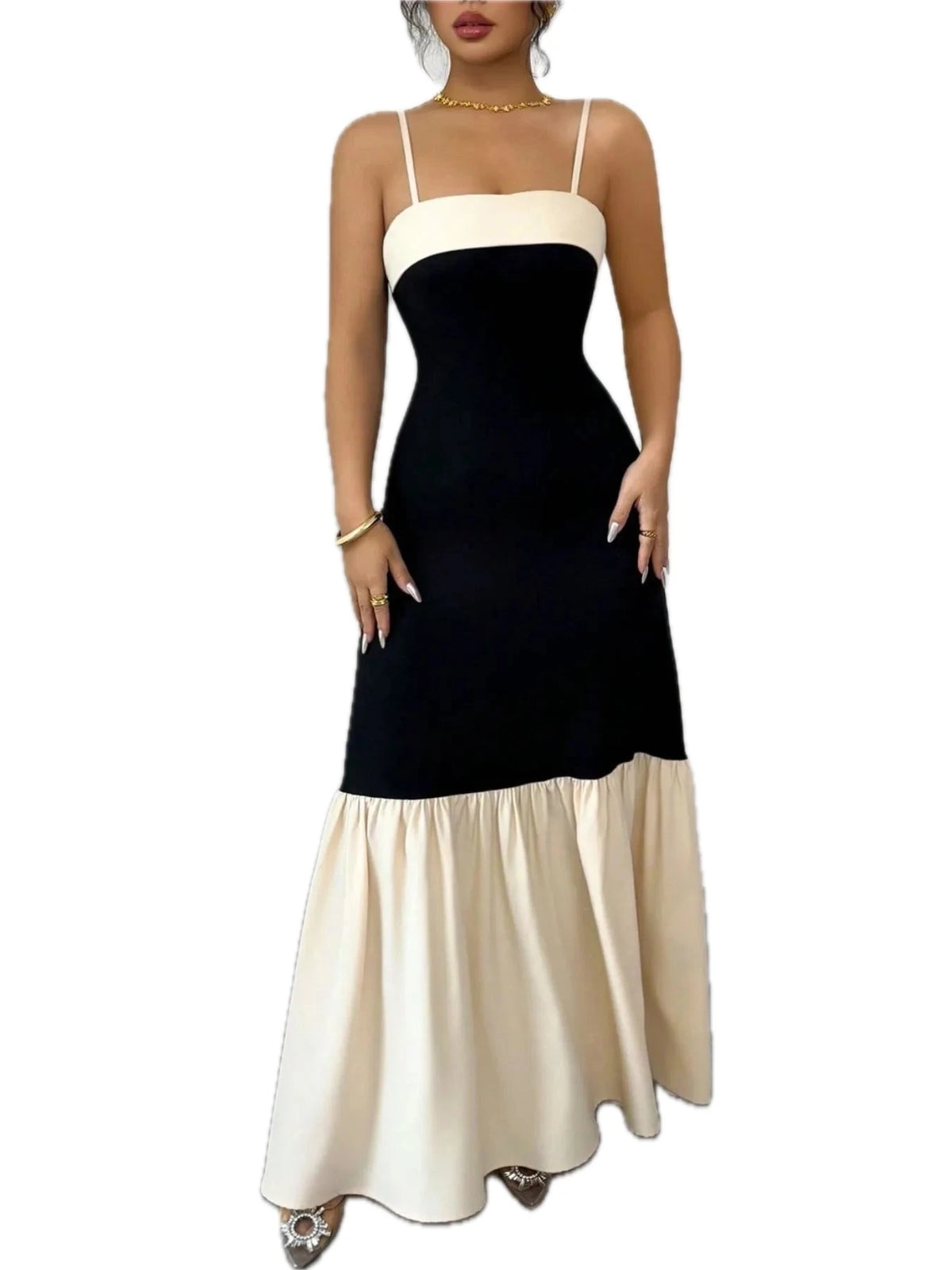 Women's Color Block Maxi Cami Dress 95% Polyester 5% Elastane Ruched Stretch Bodice Not Lined Flowy Skirt for Everyday Wear