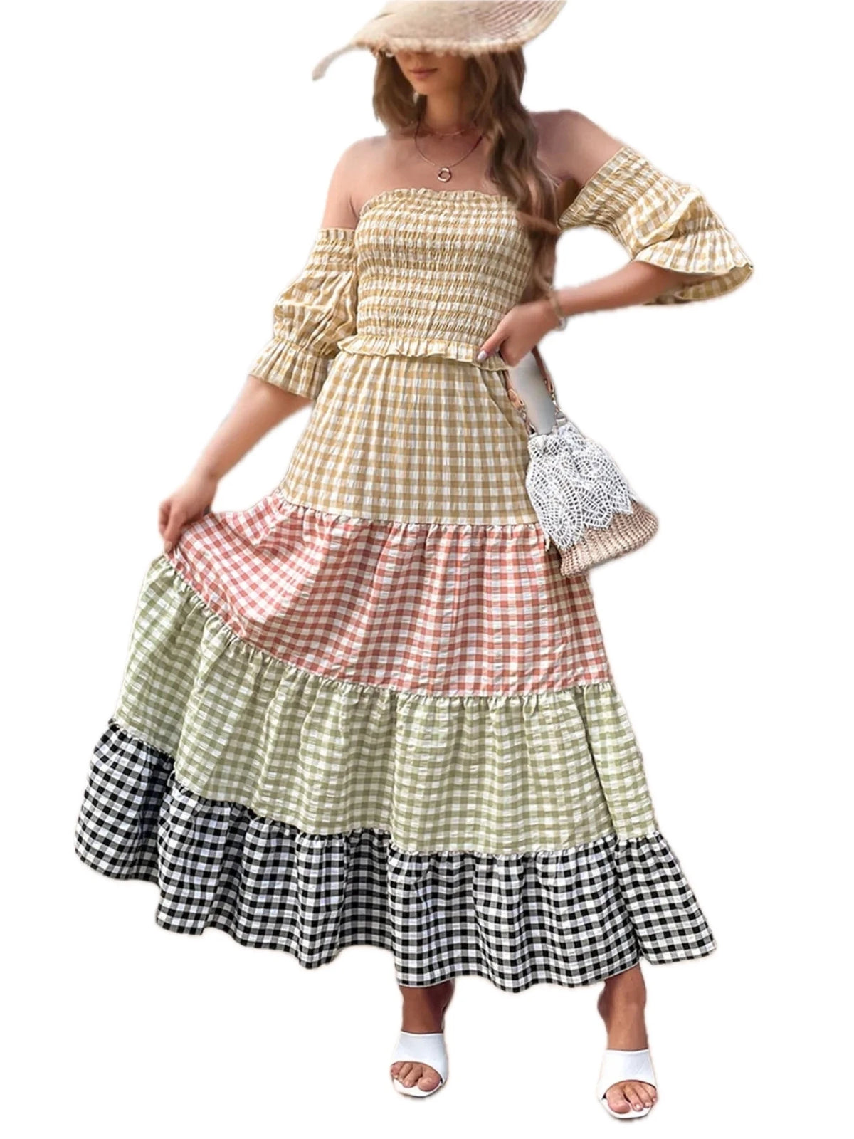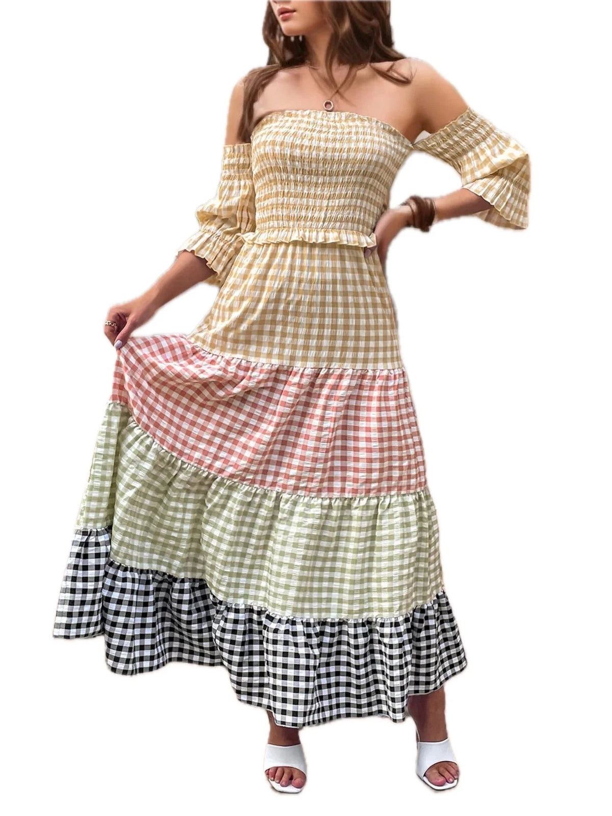 Women's Color Block Plaid Off Shoulder Maxi Dress 100% Polyester Tiered Ruffle Sleeves Smocked Bodice Flowy A Line