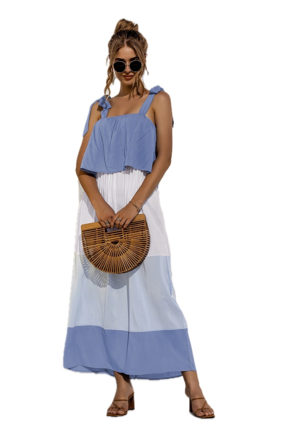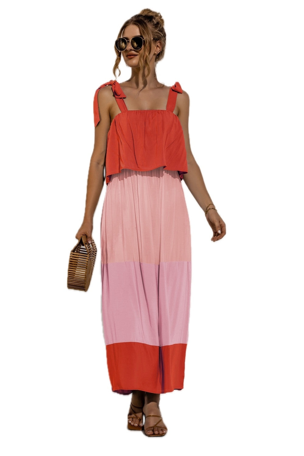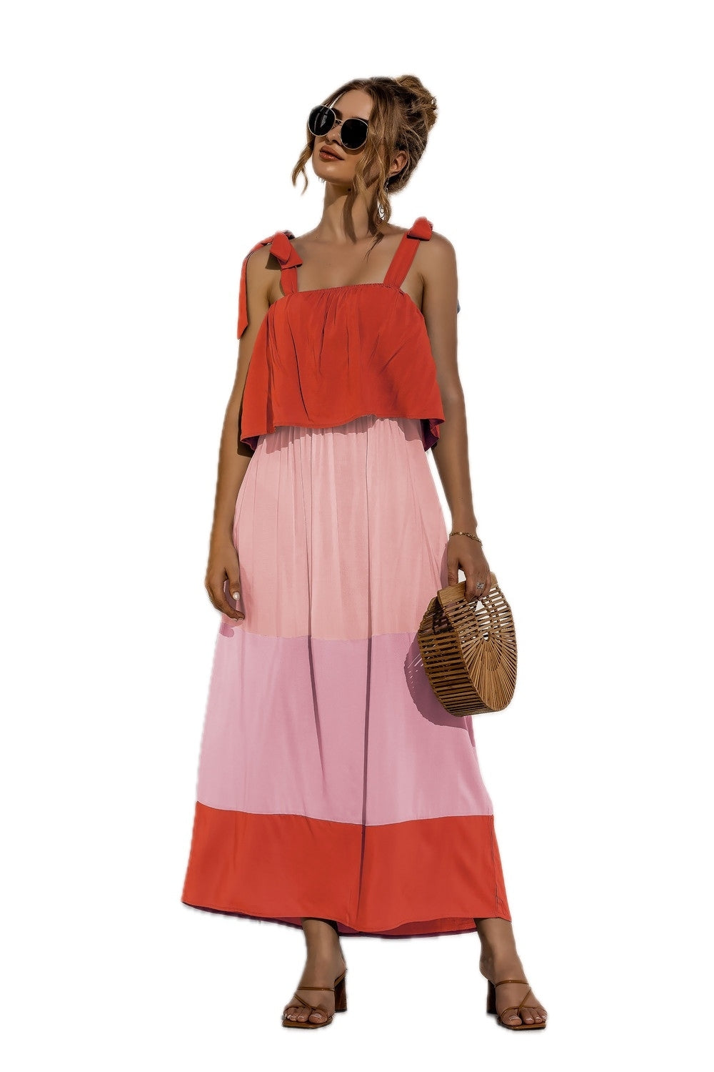 Women's Color Block Tie Shoulder Midi Dress With Square Neck Sleeveless Tiered Design 95% Polyester 5% Spandex Casual