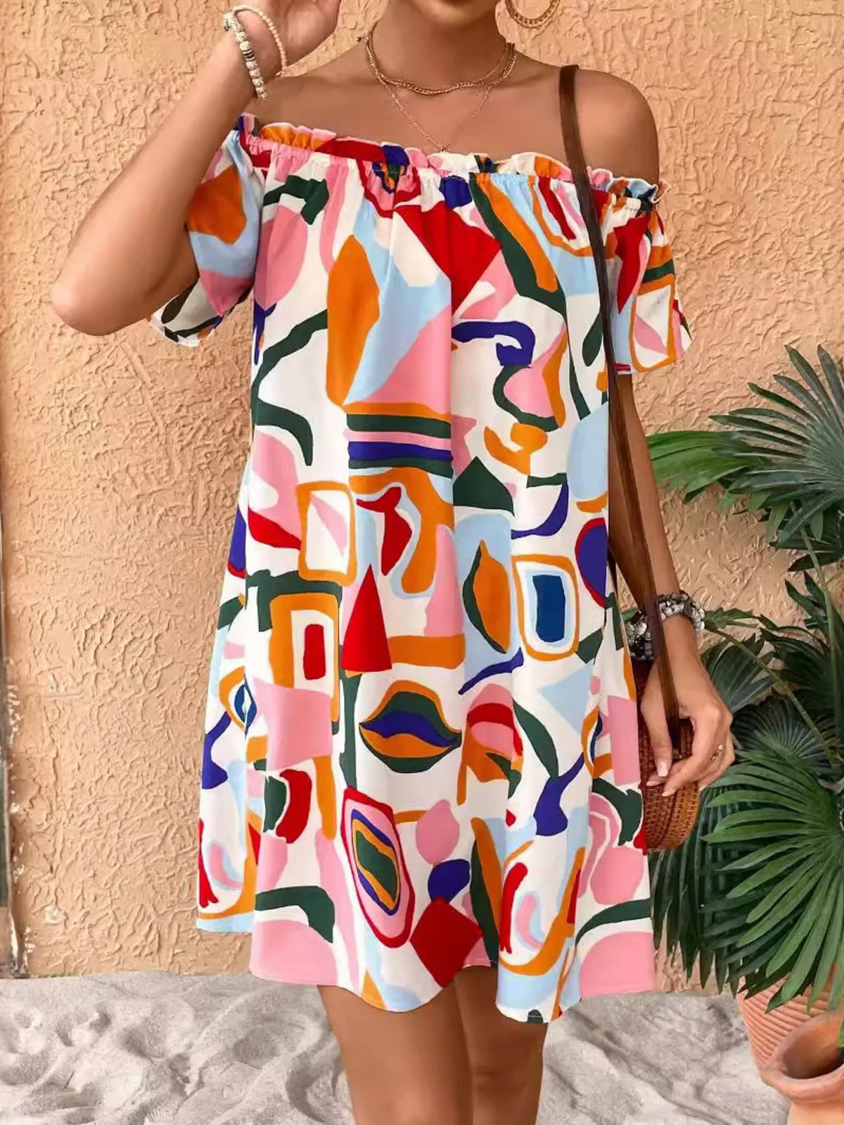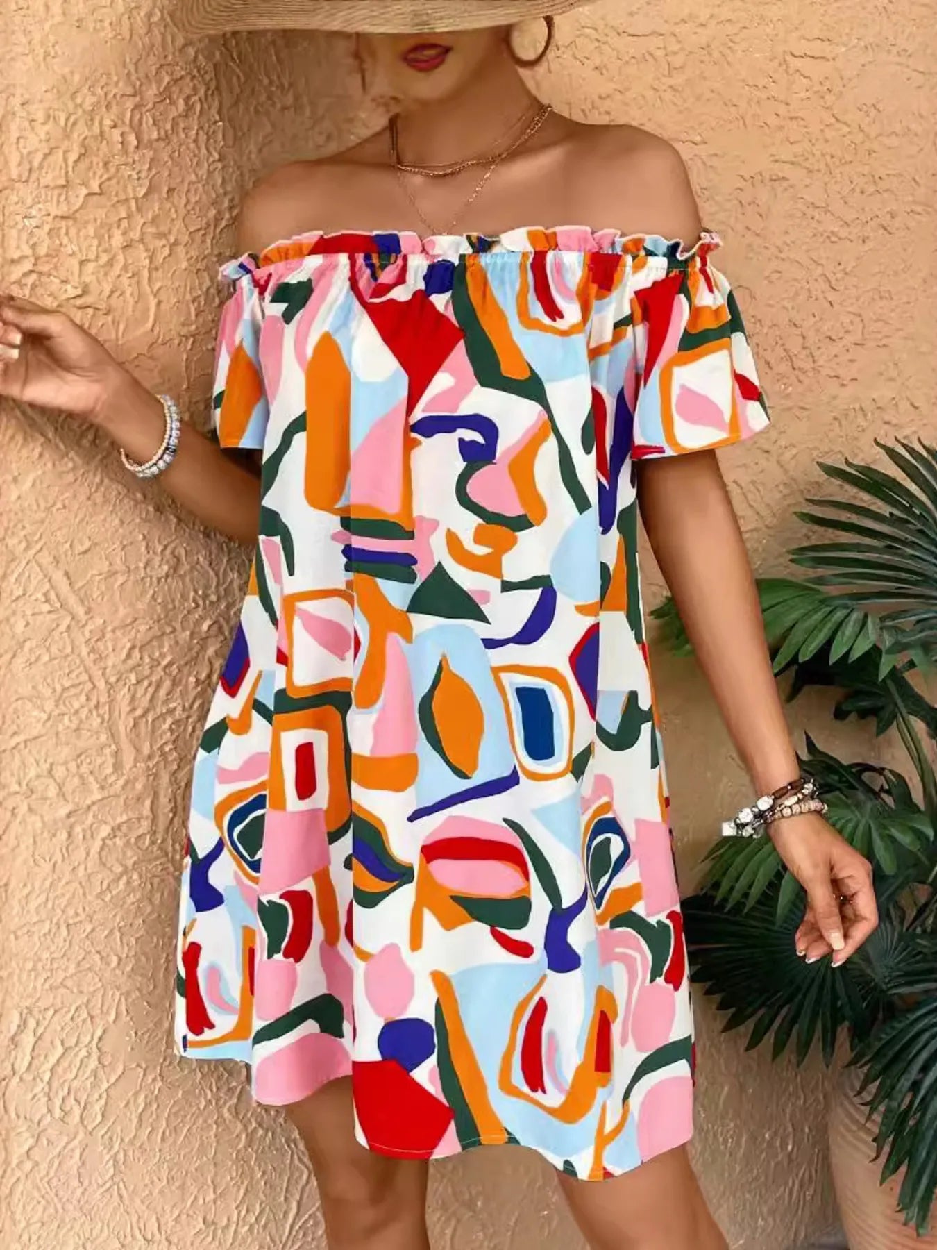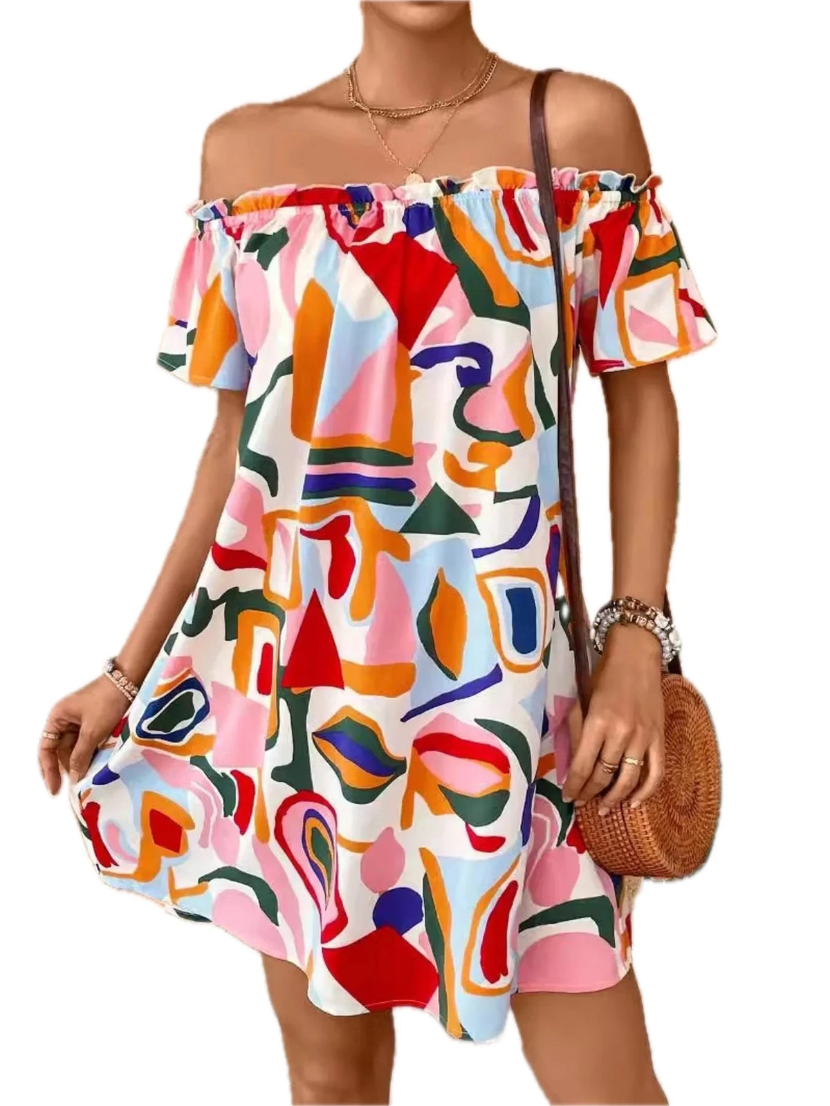 Women's Colorful Abstract Print Off Shoulder Summer Dress with Ruffles 100% Polyester Fabric Lightweight and Stylish